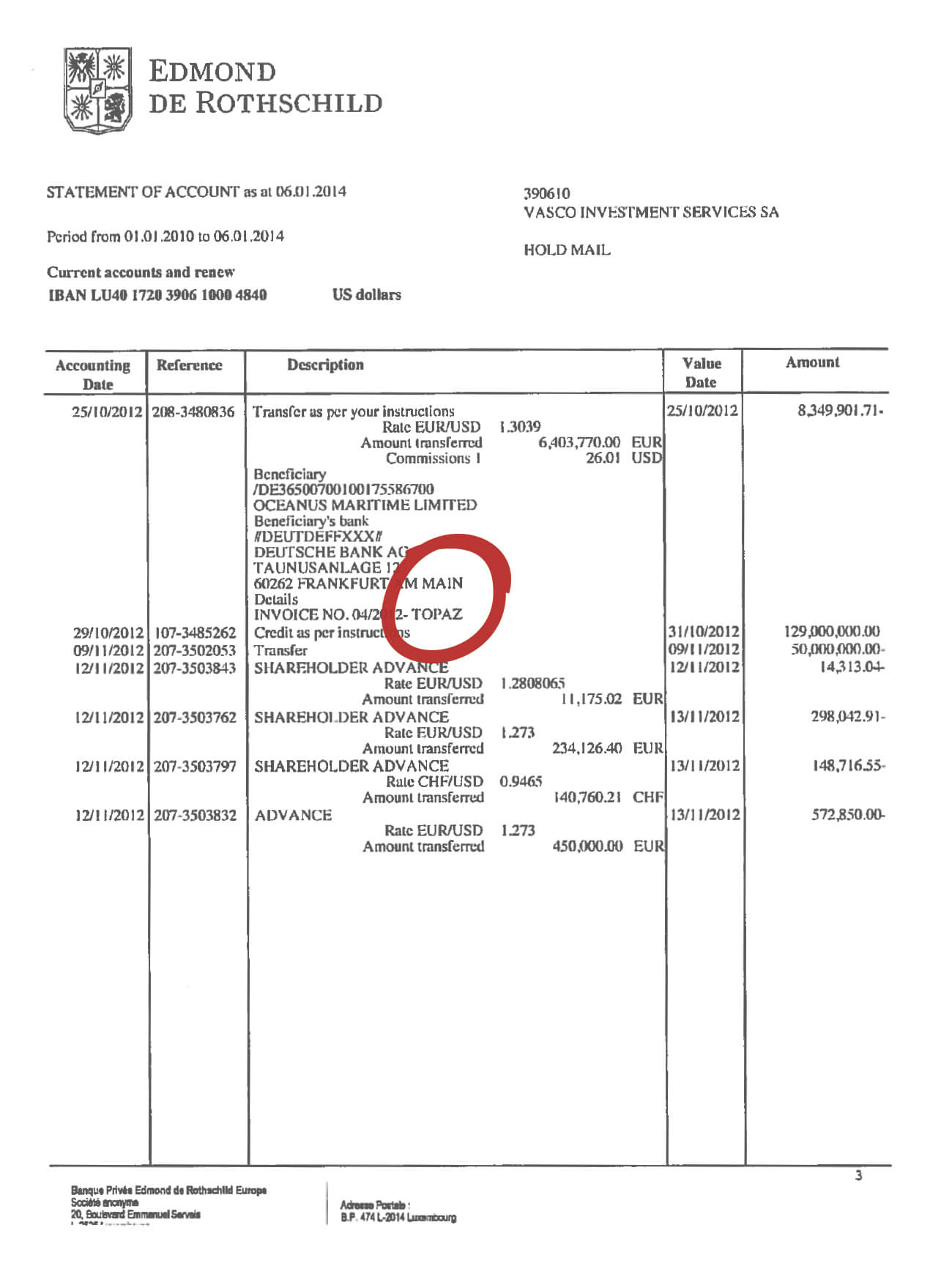 Each transfer was made to the Deutsche Bank account of Oceanus Maritime Ltd in Frankfurt for the purpose of paying for Topaz (see document).